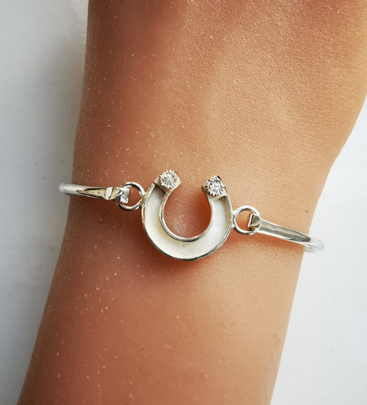Horse Shoe CZ Hook Clasp Silver Bangle